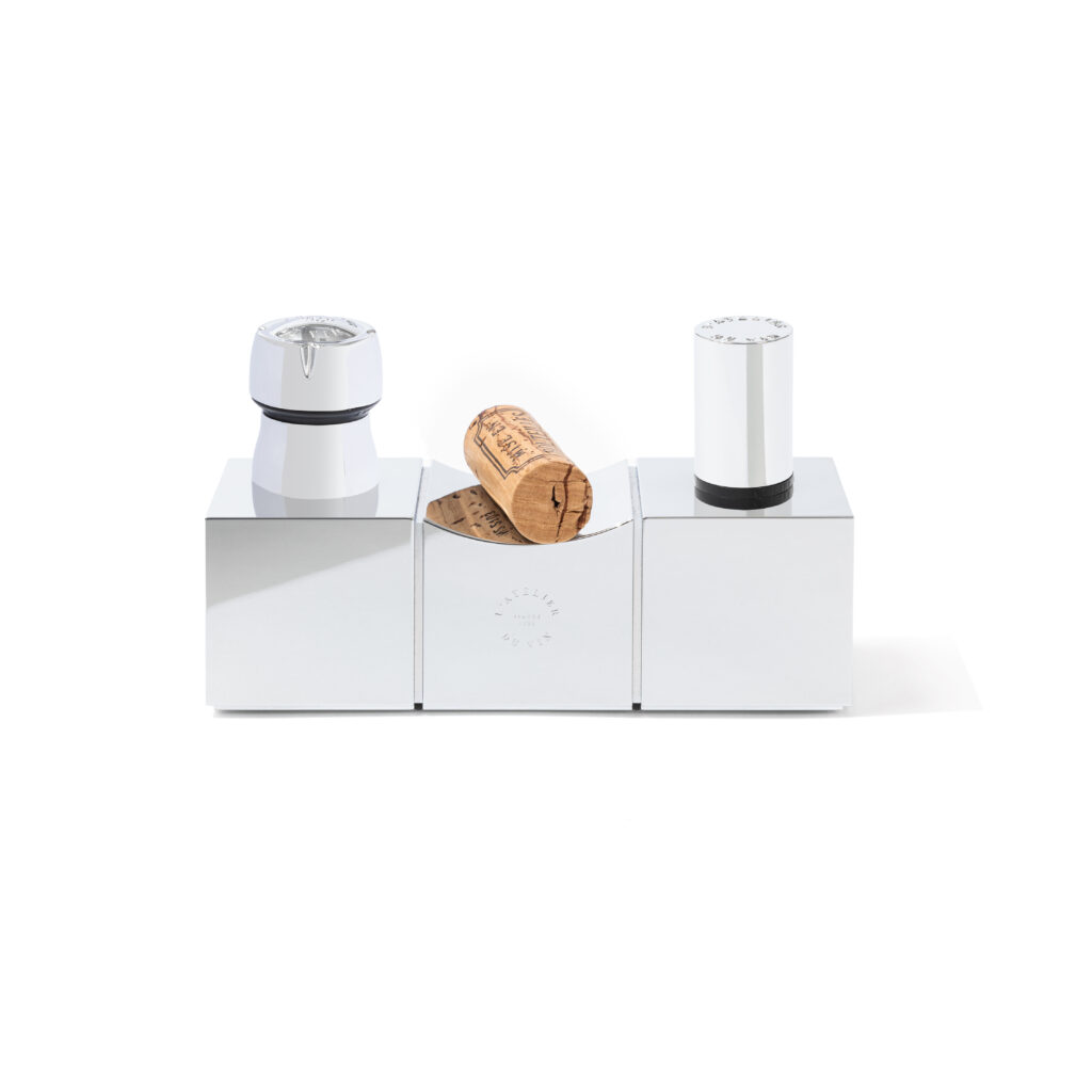 Un ensemble œnologique raffiné réunissant deux bouchons emblématiques — pour vins tranquilles et effervescents — posés sur un socle sculptural en aluminium massif.