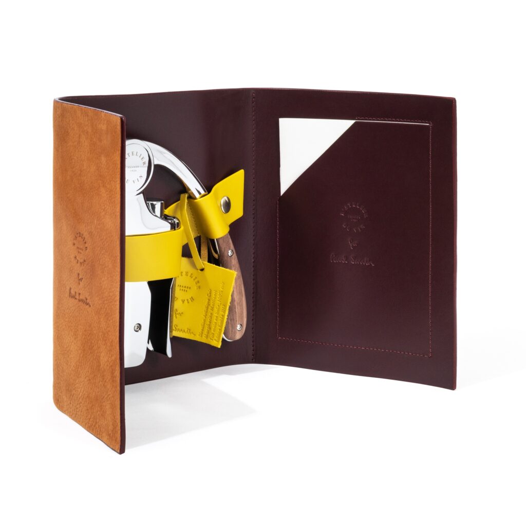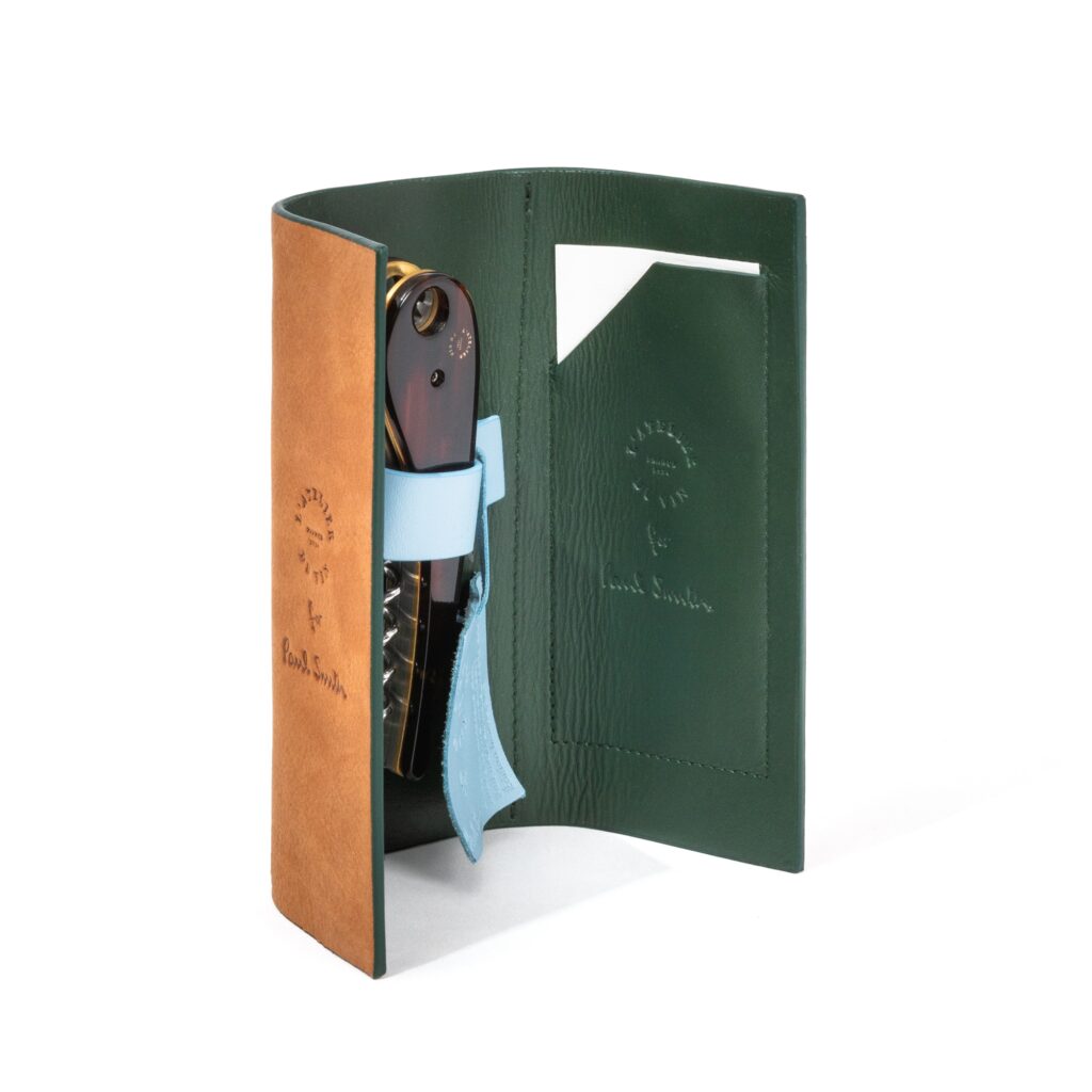 Comme un grand cru millésimé, le tire-bouchon Oeno Motion Nomad for Paul Smith ravive les sens. Déployé sur une table, un comptoir ou un rocher au bord des vignes, son étui en cuir fait main en Italie se distingue, côté intérieur lissé, par un profond grenat violacé inspiré des tons de vins rouges et de raisins noirs. La qualité de finition est digne d’une pièce de maroquinerie.