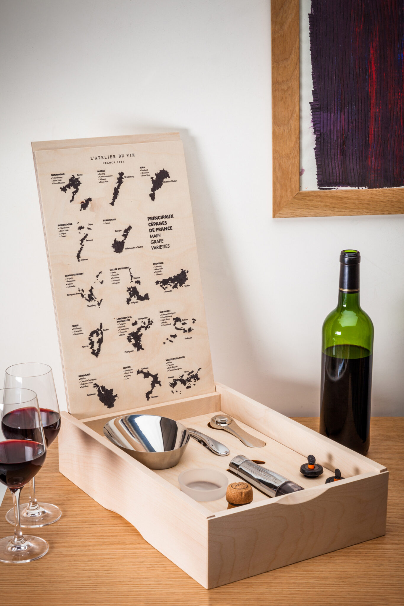 Iconic tools of L’Atelier du Vin for opening, serving and preserving still and sparkling wines in an attractive wooden gift box.