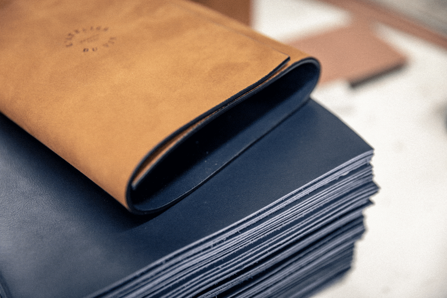 The outside of each case is made of unworked fawn leather, a raw color that develops a patina with time and peregrinations. The inside of each case is made of resistant and colored technical leather.