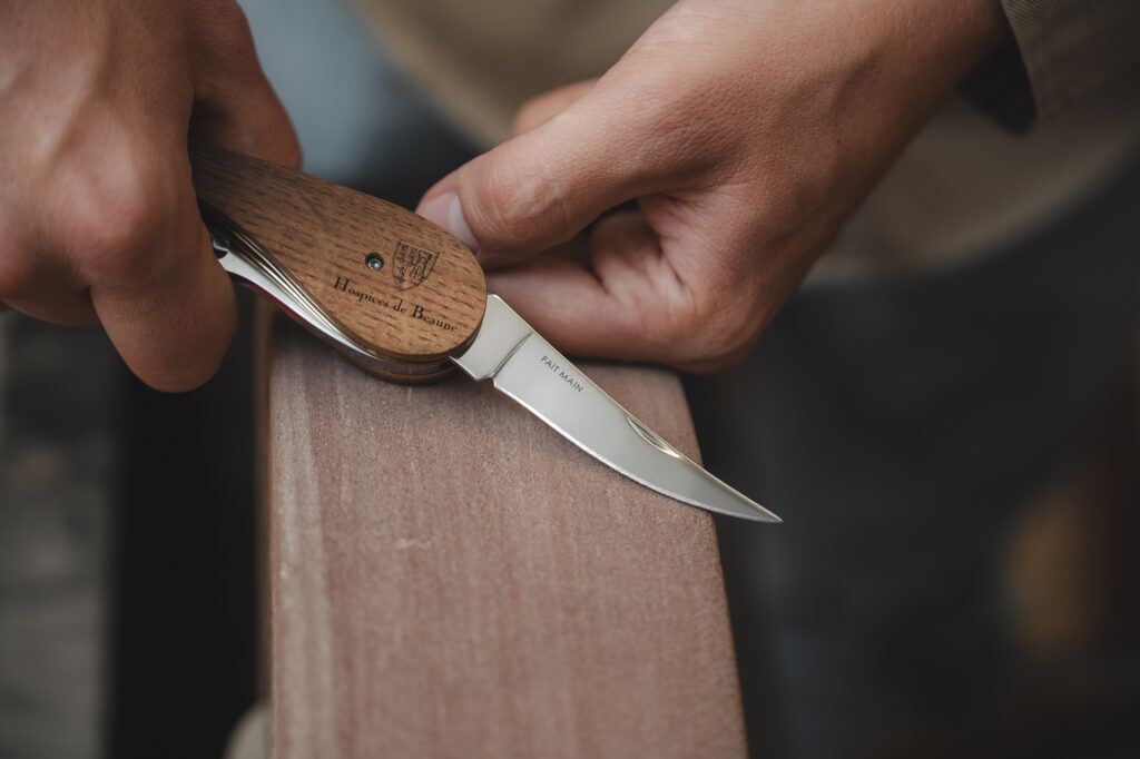 Chaque couteau est une pièce unique, fabriquée à partir de douelles de fûts de Mazis-Chambertin Cuvée Madeleine Collignon 2020 du Domaine des Hospices de Beaune, dont les facettes en bois massif ont été taillées puis ajustées par nos artisans.