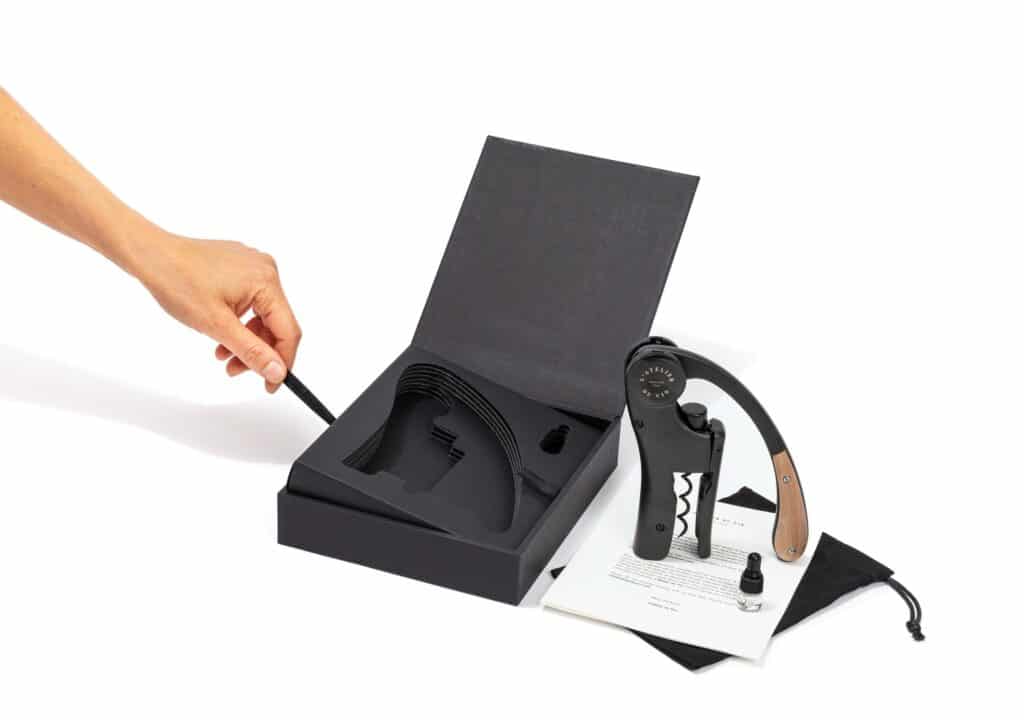 Oeno Motion Wood & Black est discret et charismatique. Par un subtil jeu de matières nobles et de couleurs sombres, ce tire-bouchon semble tiré de l’obscurité éternelle de la cave à vin à la française pour ne se montrer que lors des grandes dégustations, et sublimer l’instant décisif.