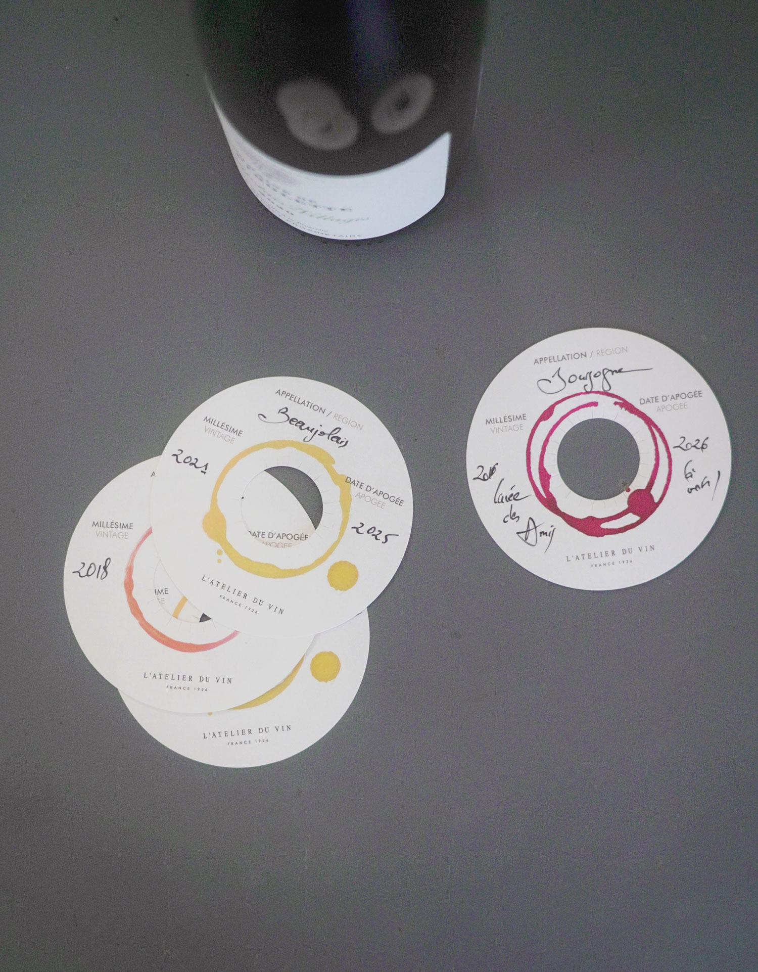 D’un simple coup d’œil, le disque de cave conçu par L’Atelier du Vin, apporte 3 informations décisives à la bonne conduite de votre cave : l’appellation, le millésime, la période de vieillissement idéale.