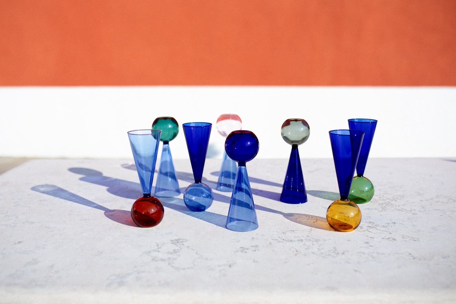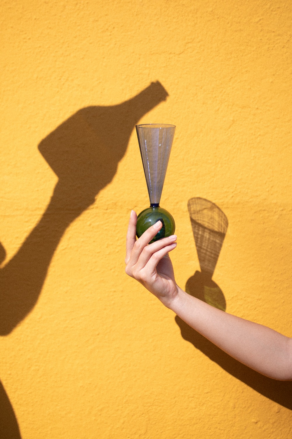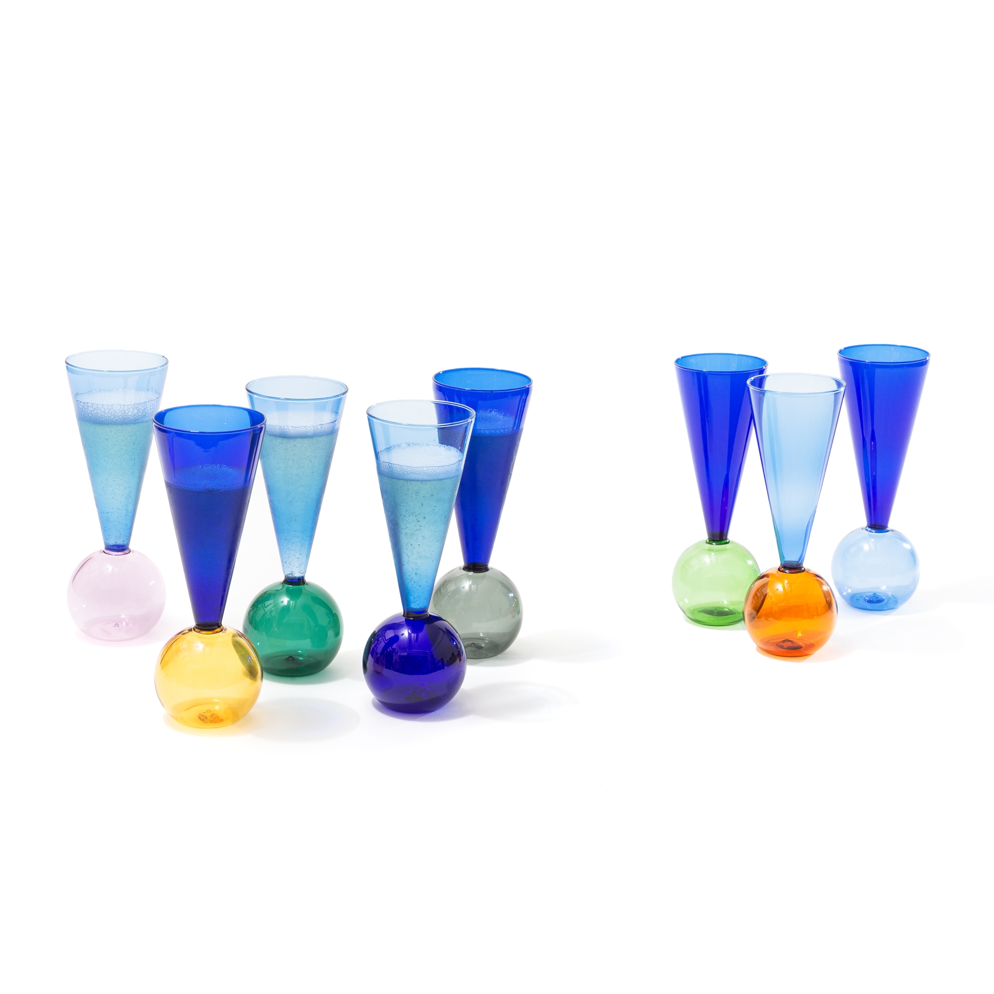 Dans cette nouvelle interprétation, la flûte à champagne se métamorphose : la silhouette traditionnelle en forme de tulipe laisse place à une forme plus directe et moderne, un cône minimaliste et élancé. Le pied plat traditionnel se transforme en une sphère captivante, évoquant une bulle de champagne, réalisée en verre transparent et délicatement coloré.