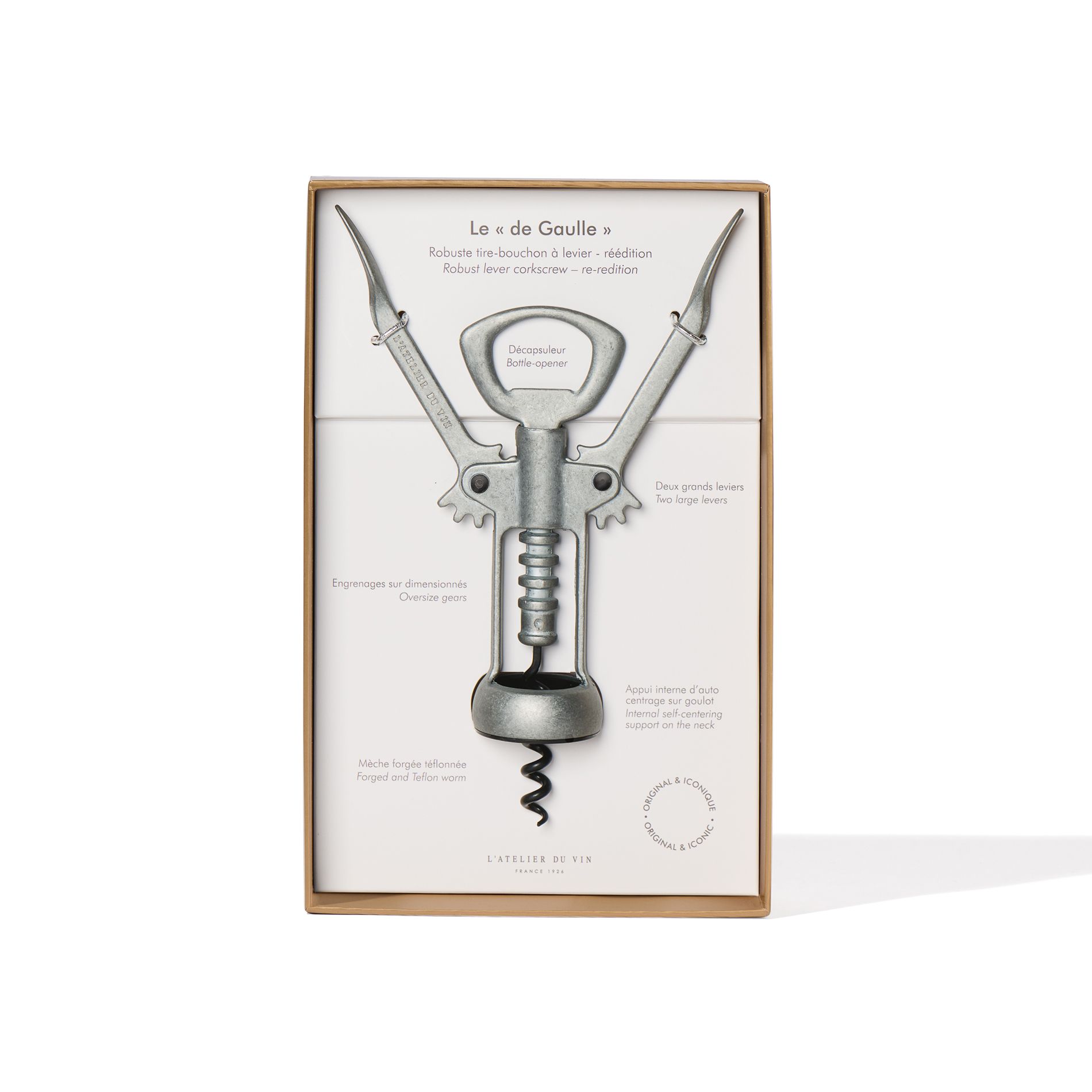 Cet outil du vin rencontra alors un franc succès populaire après guerre, au point d’être associé visuellement aux célèbres discours victorieux du Général de Gaulle, levant les deux bras vers le ciel en s’adressant au peuple Français. Avec ce je ne sais quoi qui fait son charme, ce tire-bouchon historique a été redessiné par les créateurs de L’Atelier du Vin dans le respect du design original et doté d’une mèche en téflon pour sublimer le geste de l’ouverture.