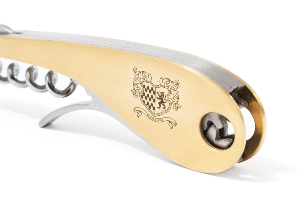Un fourreau en cuir italien véritable, cousu et peint sur ses pourtours à la main, qui protège le mécanisme. De fines lames qui glissent sans effort entre le bouchon et le verre. On le comparera à la baguette magique du sommelier, pour ouvrir ou refermer une bouteille d’un simple geste de la main. Breveté par L’Atelier du Vin depuis 1947, ce système d’ouverture permet d’extraire le bouchon sans le percer, et de le réinsérer dans le col comme si de rien n’était.